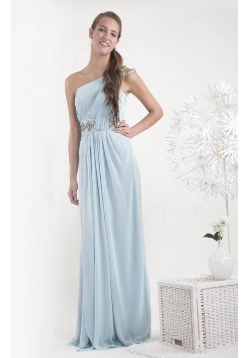 Pale blue long chiffon dress with diamonte detail