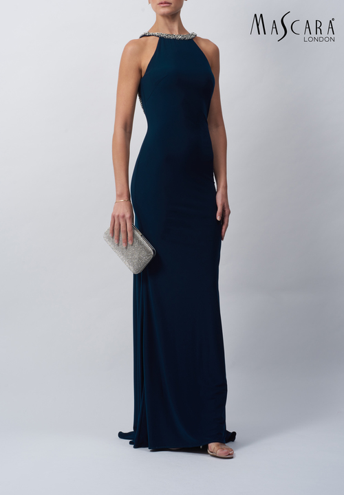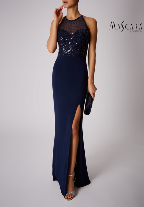 Navy lond dress with beaded bodice